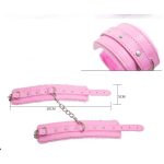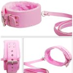 El set incluye: dos juegos de esposas para manos y tobillos forradas en peluche, antifaz ciego forrado en peluche, mordaza, collar forrado en peluche con correa, látigo y cuerdas para amarres, color rosa.