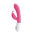 El Vibrador recargable multi-velocidad Gene es color rosa, tiene un estimulador de clítoris en forma de conejito y cabeza pronunciada.